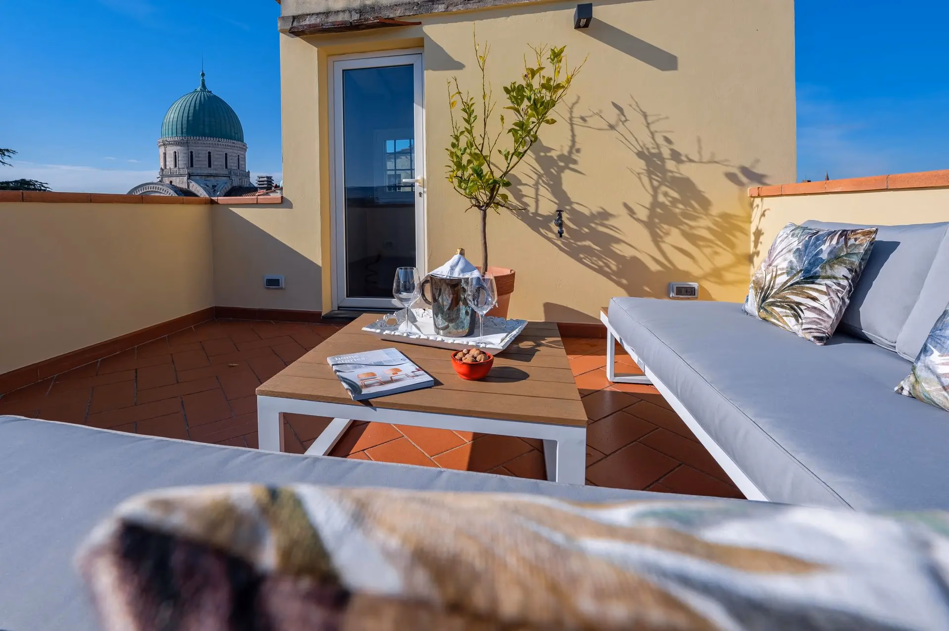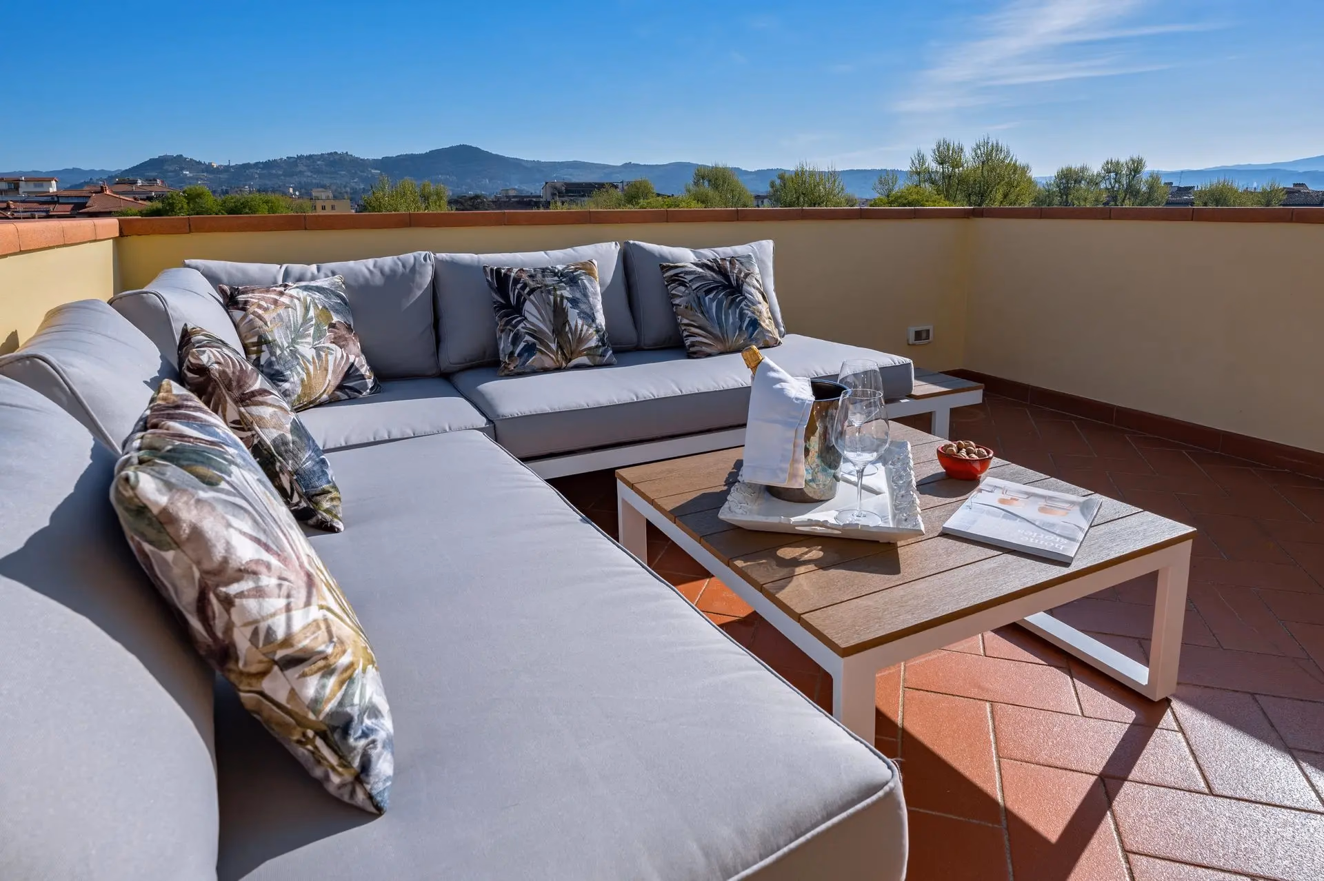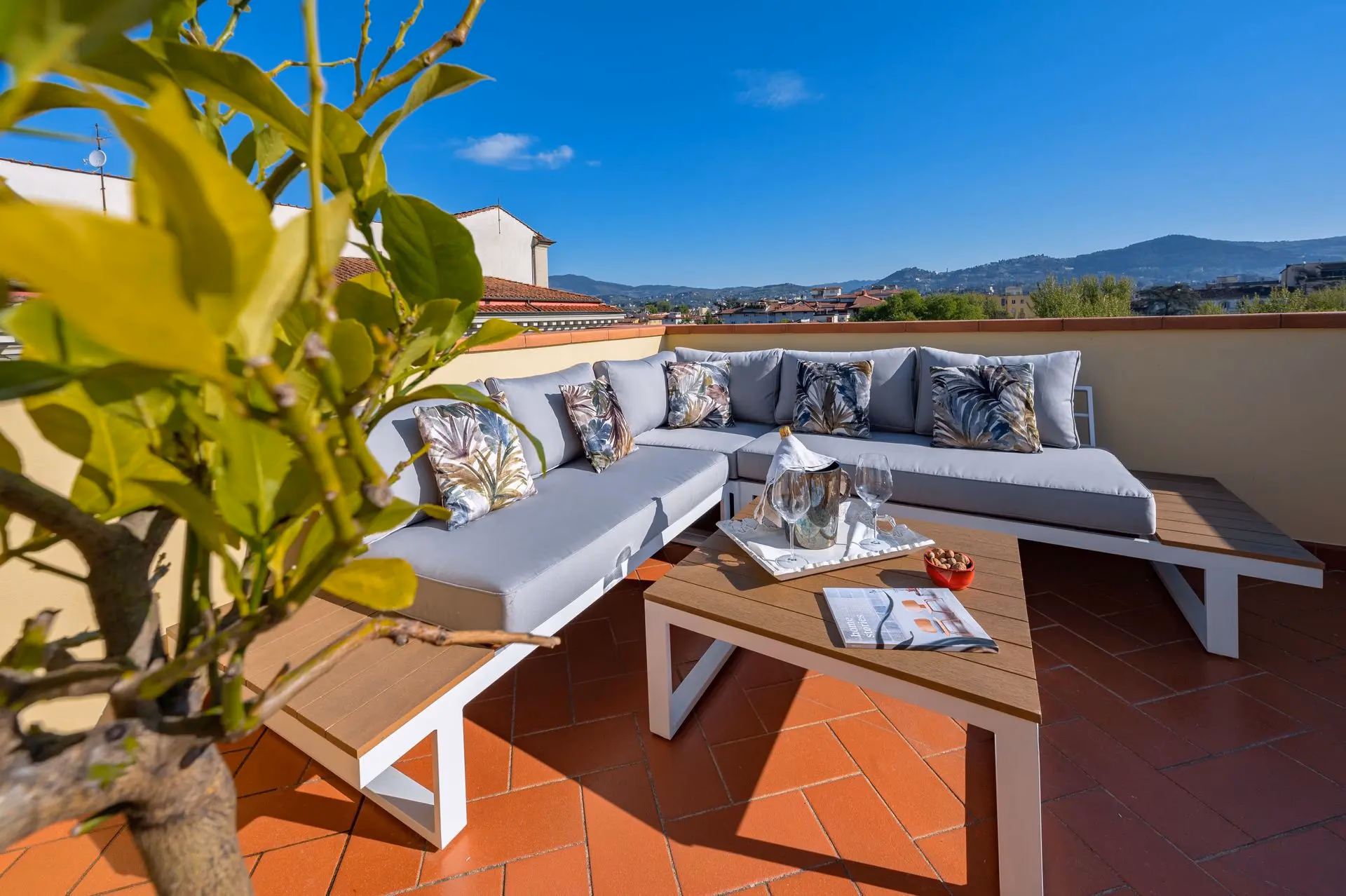 Refurbished with tailored furniture, featuring one patio in front of the kitchen and one rooftop terrace with a 360° view of the city and the Florentine hills.